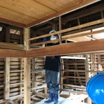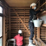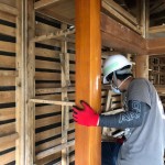 本日は、床下の木枠に張り付いたベニヤ板剥がしや釘抜きから始まり、ブラッシングと消毒液での拭き取りをしました。