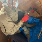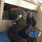 家の中のフローリングを傷つけないように、はじめに家の中にブルーシートを敷き、そのシートの上で作業を行いました。