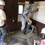 午前中は、床があるうちに天井より高いところにある泥を取ろうと判断して、みんなで作業をしていましたが、床下の泥がまだ湿っていて、さらなるカビの発生につながるような気がしたため、午後は床剥ぎを進めることにしました。