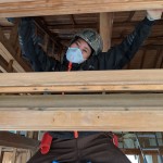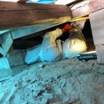 本日お邪魔したお宅は、被害のとても大きな地区で、実際このお宅も2階まで浸水しました。これまで、天井や壁を剥いできましたが、天井より高い場所の木枠の上にはレンガのような泥の塊が残っていました。また、床をまだ剥いでいないため、床下にもびっしりと泥が溜まっています。そして、木枠の多くの場所に大量にカビが発生してしまっています。