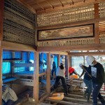 土壁はがしでは、手のこや電動ノコギリを使って、竹と竹を編んでいる縄を切って剥がしていきます。