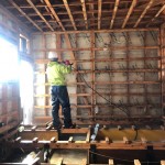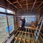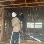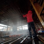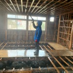 作業内容は高圧洗浄機で天井の枠組みや壁、ねだをすべて泥を落とす作業と、それらの消毒を行いました。