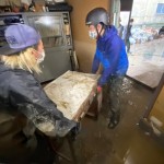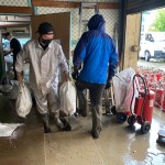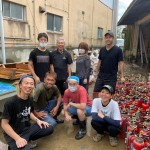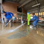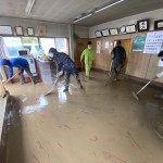 作業内容は事務所、倉庫の水に浸かってしまった資材や書類などを外へみんなで運び出しながら床に溜まった泥を高圧洗浄機で洗い流していきました。