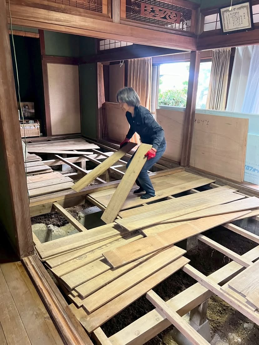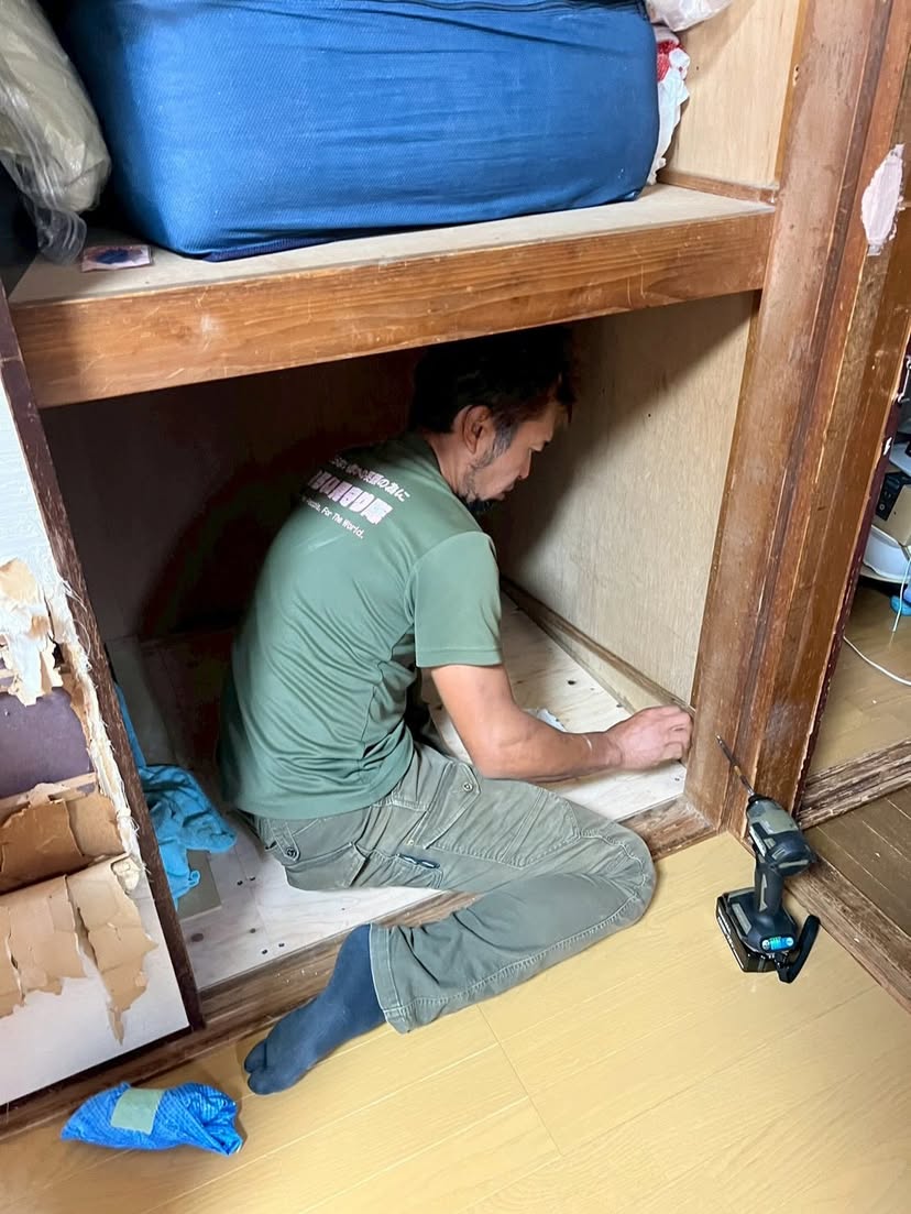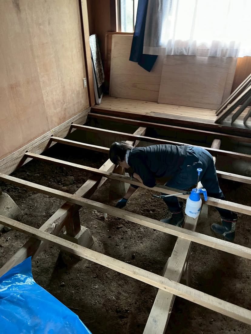 次に伺ったお宅では消毒作業や撹拌作業、災害ゴミの処理も完了したので残すはファンを回収して床板貼りとなります。本日は床板を元あった通りに並べるところまでは完了したので次回からは床板を貼って終了です。来た時よりも美しくを意識して活動に参加しているので木がボロボロになってしまっている棚を取り除き新しくすると言った提案も行いましたが住民さんはもう前みたいに身内で集まることも減ったしこの部屋は使わないと思うから大丈夫とおっしゃっており今回の水害がその選択に拍車を掛けてしまったんだなと思うと悔しいなと思いました。作業を完了することで住民さんの不安や健康被害が取り除かれることはあっても本来のように使われなくなったり水害の嫌な思い出が残ってしまうのは悲しいのでいつか住民さんも前を向くことができたらこの部屋でまた新たな楽しい思い出を作っていってほしいなと思いました。今はこの部屋に対して後ろ向きな感情もあるとは思いますがまた床板が貼られて綺麗になった姿を見たらこの部屋を使いたいと思ってくれるかもしれないので心のケアもしつつ支援を完了させていきたいなと思いました。