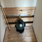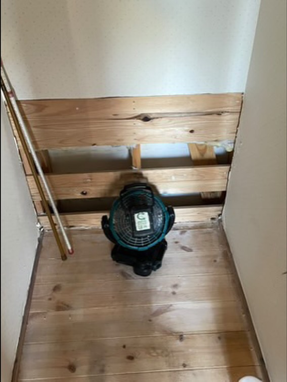 脱衣場下のエリアをちり取りや掃除機などの道具を使い掃除。乾燥した泥や細かい石膏ボードの破片を回収し、土嚢袋に分別しました。
