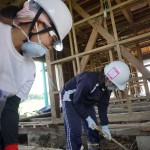 土壁の作業は、剥がしやすけれど、重い土壁がブロックのような状態でとれることもあり、脆くなりかけている床板の上で脚立に登っての作業はより慎重行う必要があります。