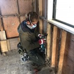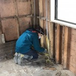 本日は床板を剥ぐ前に、上の方の柱に溜まっている泥を落とす作業と、接着で張り付いているベニヤ板を剥がす作業を行いました。