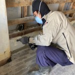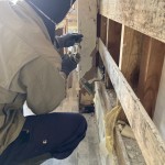 壁を剥ぐと、柱にはやはり多くの泥やカビが付着していました。