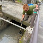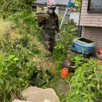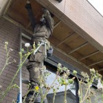 軒天の中に顔を入れて大きい塊の泥を取り出し、