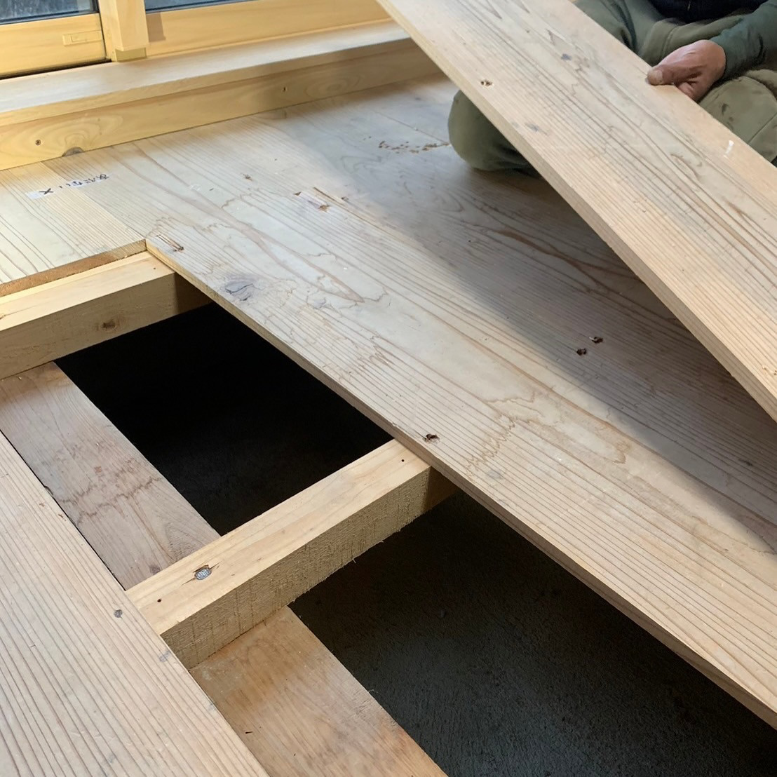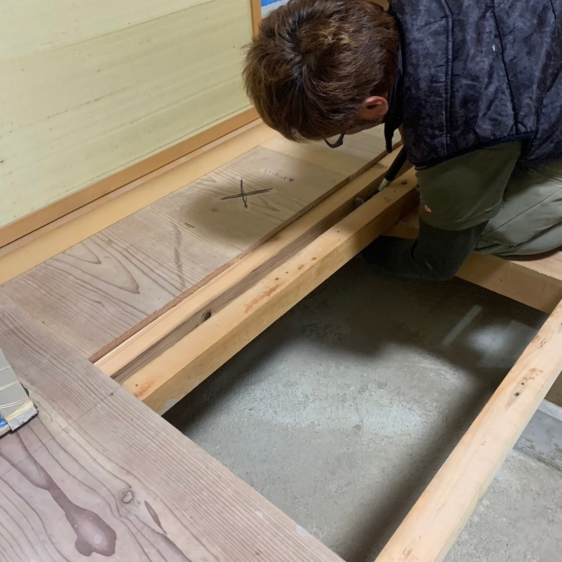 床下に潜る為、床下板を丸鋸であけて、剥いでいた為、まだ畳を敷ける状況ではなかった。